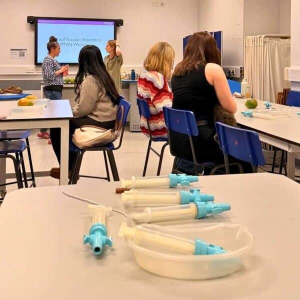 Setup for the Manual Vacuum Aspiration (MVA) workshop at the Royal Free Hospital in London. Participants were introduced to early abortion care techniques in a skills-based session.